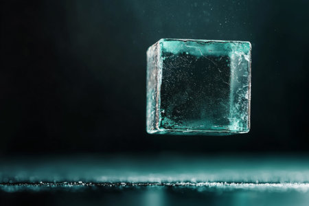 A translucent ice cube hovers above a dark surface, illuminated by a soft glow. Tiny air bubbles are trapped within, creating an enchanting, ethereal effect that captivates the viewer.