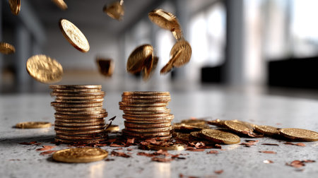 Golden coins captured in mid-air as they fall, with a dramatic bokeh background, symbolizing wealth, fortune, and financial success in a dynamic and energetic setting.