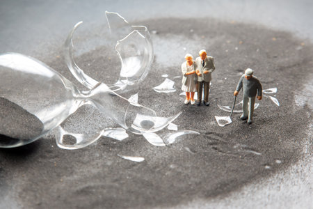 Miniature figures gather around shattered glass pieces on a dark, textured surface. The small scene conveys a moment of contemplation or discussion among the tiny characters.