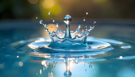 A water droplet impacts a dark blue surface, creating ripples and reflecting light in a serene setting.