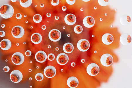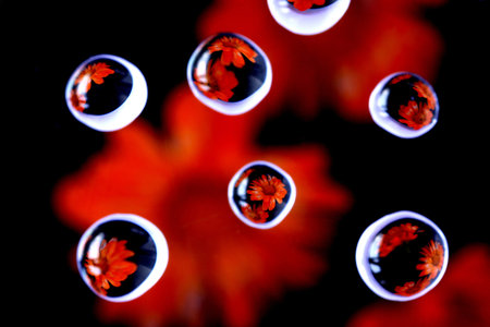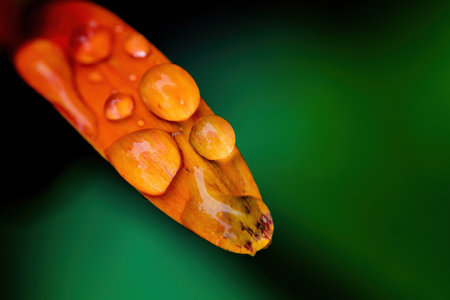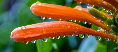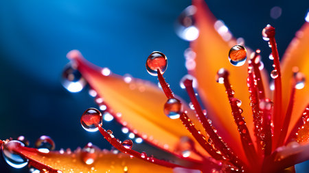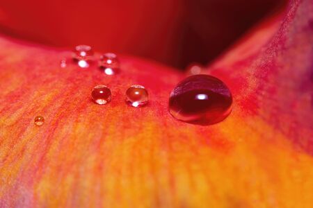 Macro of several drops of water in a red and orange flower. Natural environment. close-up view