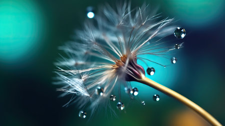 Beautiful shiny dew water drop on dandelion seed in nature. close-up macro. Sparkling bokeh. Dark blue green background.
