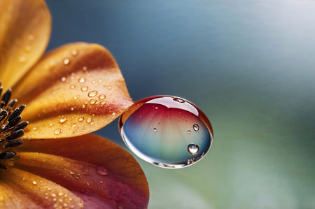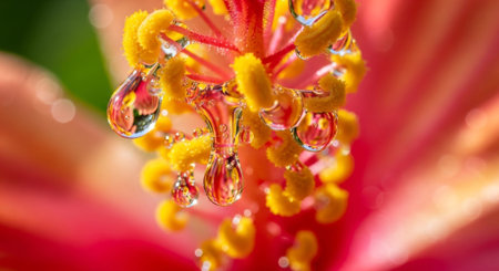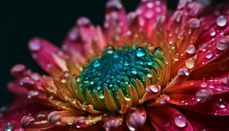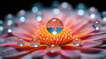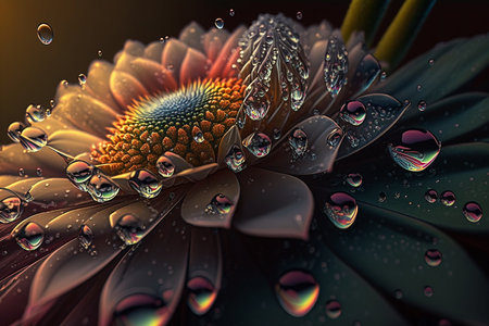 Abstract macro fantasy of dew drops on colorful garden flowers in golden sunlight, generative ai