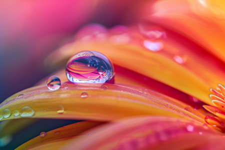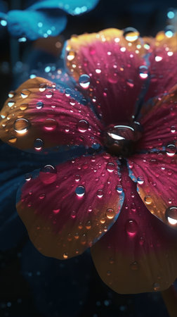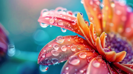 Colorful flower petals shimmer in vivid hues with droplets reflecting light, showing natural beauty.