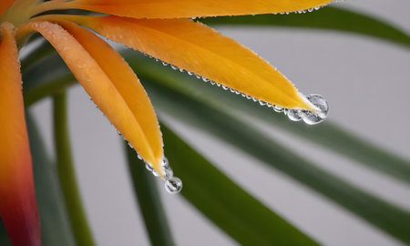 Soft rain falling gently on Canna lily, with water droplets forming and slowly dripping. The background is softly blurred with a natural, moody atmosphere.