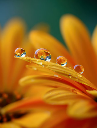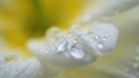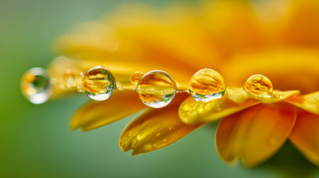 Tiny glistening spheres rest along vivid yellow petals, capturing intricate reflections and conveying a peaceful, detailed glimpse into nature's delicate beauty.
