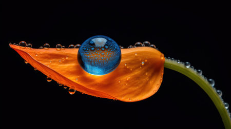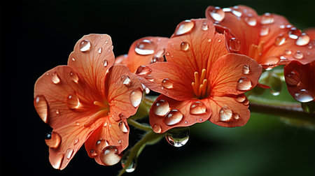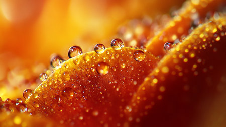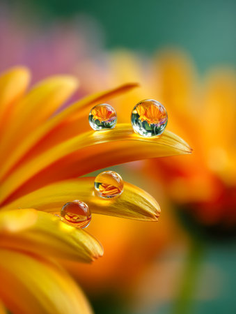 Tiny beads of water mirror fiery orange hues of blooming petals, set against a gentle blurred backdrop of blossoms, creating a serene and mesmerizing macro view