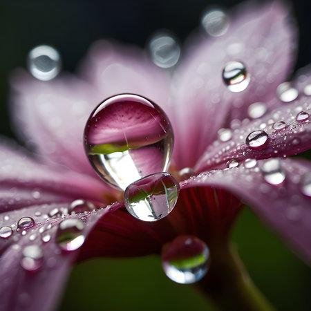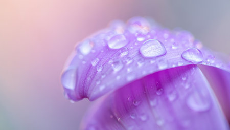 A close up of a delicate purple flower petal with water droplets, soft and beautiful. The drops glisten in the light.