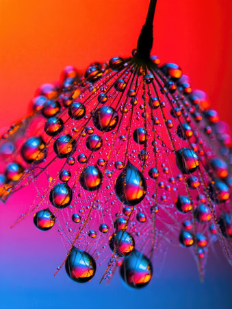 A close up shot of a dandelion seed head glistening with water droplets against a colorful backdrop.
