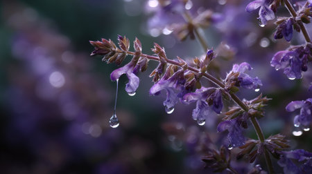 Soft rain falling gently on Catmint, with water droplets forming and slowly dripping. The background is softly blurred with a natural, moody atmosphere.