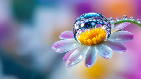 A vibrant water droplet reflects colorful flowers on a green stem at midday in a lush garden.