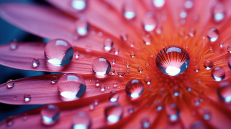Macro Close up Shot of Many Water Drops on red petal . Dew drops on a flower. Flower, freshness. Soft focus . Bokeh effect