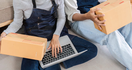Couple Checking Merchandise Boxes for Online Delivery While Using Laptop for E-commerce Business