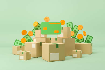 Cardboard parcels and credit cad with gold coins and banknotes, light green background. Concept of sale and online shopping. 3D rendering