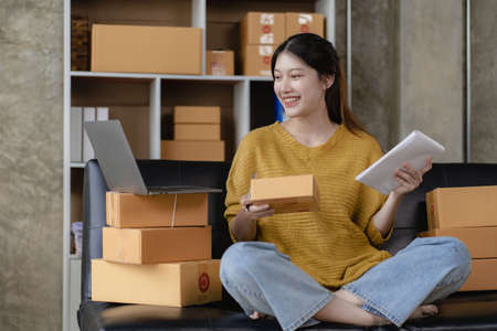 Asian woman working at home with yellow box and laptop for taking orders, sme business ideas on parcel delivery