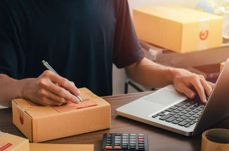 laptop computer at workplace of start up, small business owner, freelance, seller. cardboard parcel box of product for deliver to customer. Online selling, e-commerce, packing, shipping concept