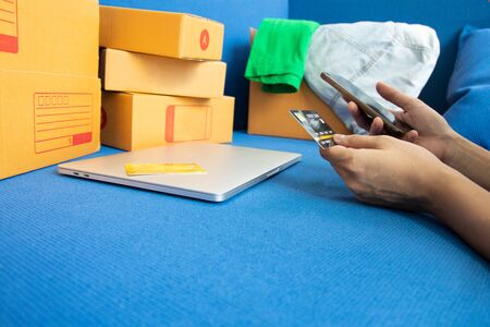 Close up hand of young woman small business owner online shopping at home preparing package product on background. SME entrepreneur or freelance life style concept.
