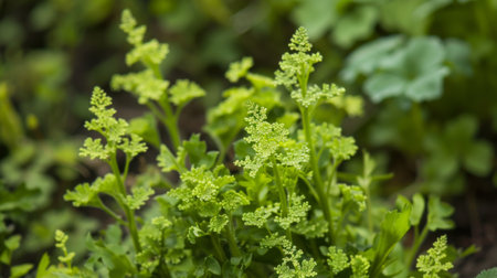 This close-up shot showcases a dense cluster of vibrant green plants, featuring lush leaves and intricate patterns. The plants appear healthy and thriving, filling the frame with a rich green color palette.