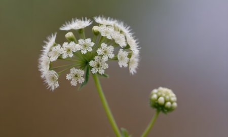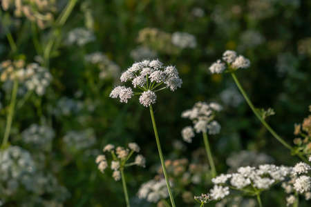 White lacy flowers of goutweed aegopodium podagraria against blurred background