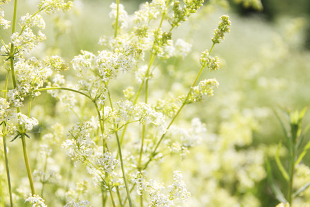 Thalictrum minus Meadow rue flowers. Ranunculaceae perennial plants. Numerous pale yellowish white florets on panicles from July to September.