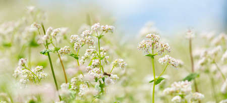 Close up of flowers of buckwheat. Blooming buckwheat field