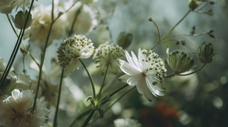 A close-up view of delicate white flowers swaying gently in a sunlit meadow, creating a serene and tranquil atmosphere. The soft focus and warm light evoke feelings of peace and natural beauty, inviting viewers to immerse themselves in the calmness of nature.