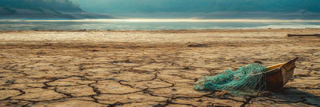 A once vibrant lakebed now lies dry, showcasing cracked clay and remnants of fishing nets, creating a somber and reflective mood.