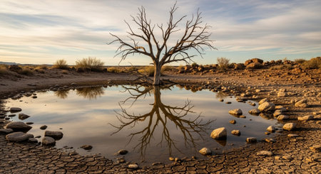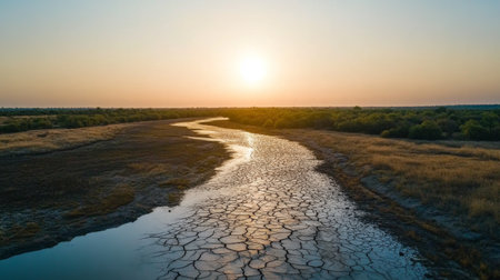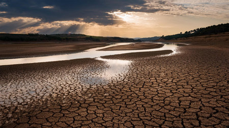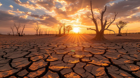 This image highlights the effects of prolonged drought and climate change, showcasing cracked earth under a sunset, emphasizing the urgent need to address todays environmental challenges