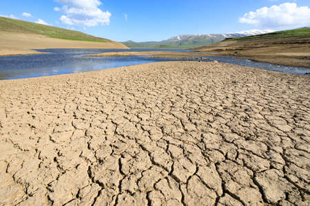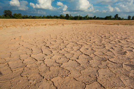 The landscape is arid, cracked by hot weather and without precipitation for a long time due to global warming, overlooking the sky and the horizon in the canals under hot air and scorching sunlight.