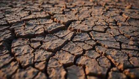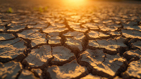 Captivating view of dry cracked earth illuminated by warm sunlight at dusk. This image highlights textures and environmental concerns related to climate change.