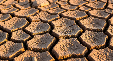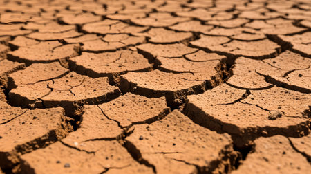 Close-up of parched earth with deep cracks caused by lack of moisture, rich texture and earthy tones under bright sunlight