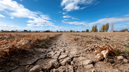 A wide-angle view of dry, cracked soil in an agricultural field, highlighting the impact of drought. The backdrop features a dramatic sky with clouds and distant trees, creating a striking rural scene.