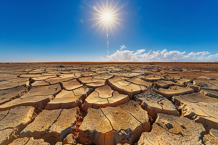 A vast, cracked desert under the scorching sun with a clear blue sky above, symbolizing environmental disaster and climate change. the dry land contrasts against the vibrant sky, emphasizing its impact on nature's environment. this visual representation is designed to convey that climate research em