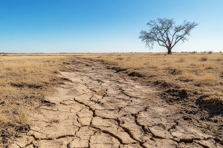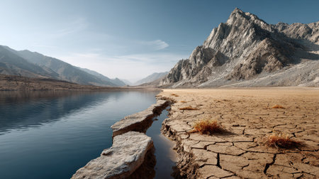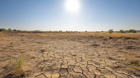 A vast, arid landscape features cracked earth under a bright sun. The scene highlights the effects of drought and climate change on the environment, showcasing the resilience of nature.