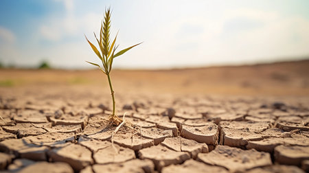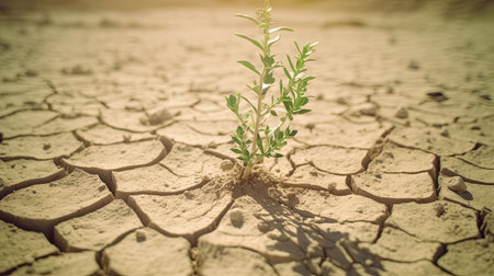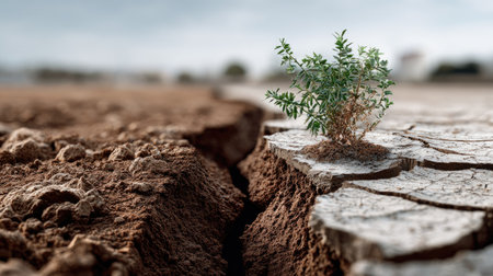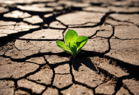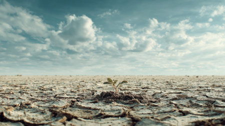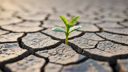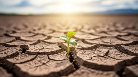 A single green plant emerges from dry, cracked soil, symbolizing resilience and hope in harsh environmental conditions. The image captures the struggle for survival in nature.