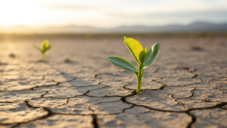 A close-up view of young plants breaking through cracked earth under a soft sunset. This image symbolizes resilience and hope in challenging conditions, showcasing the power of nature.