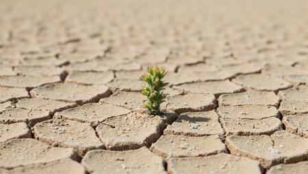 A vibrant green plant emerges from the dry, cracked earth under a clear sky. The image showcases a contrast of textures, with the rough, arid ground against the smooth, fresh plant. The composition suggests a challenging environment, potentially suitable for editorial content or themes of perseverance.