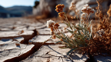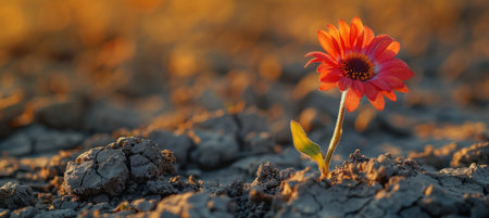 A resilient flower blooming from dry, cracked soil symbolizing hope, perseverance, and survival in harsh conditions