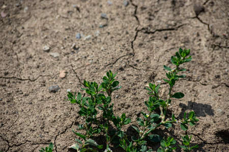 dry plant in arid area, cracked soil, try to growth, selective focus