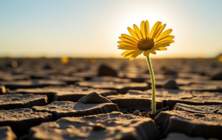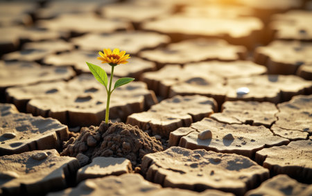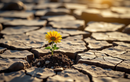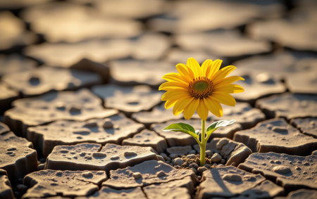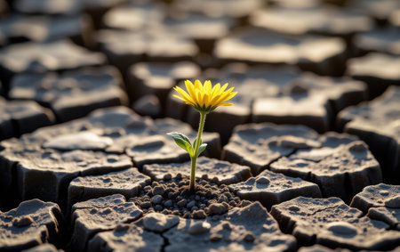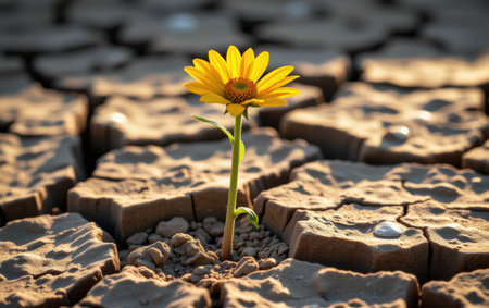 A single yellow flower blossoms from cracked, dry earth under a warm, diffused sunlight. The image showcases textures of the parched ground and vibrant flower. It implies resilience and growth in a challenging setting, suitable for illustrating concepts of perseverance and nature. This image is suitable for various commercial uses.