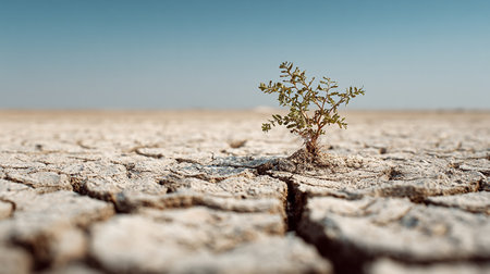 Drought-affected cracked earth with single dried plant highlights water scarcity.