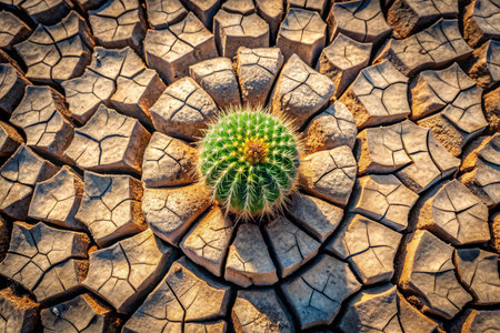 Desert plant thrives on parched, fractured terrain, sweltering day, impacted by climate shift. Generative AI