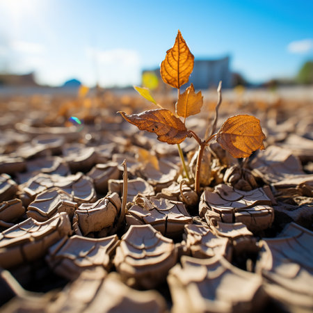 This striking image depicts a small plant thriving in cracked, dry soil, symbolizing resilience and the power of nature to adapt to harsh environments.
