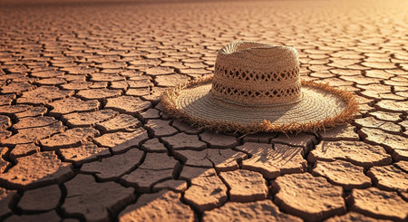 A straw hat rests on a vast expanse of cracked, dry earth under intense sunlight. Clear details and vibrant co...