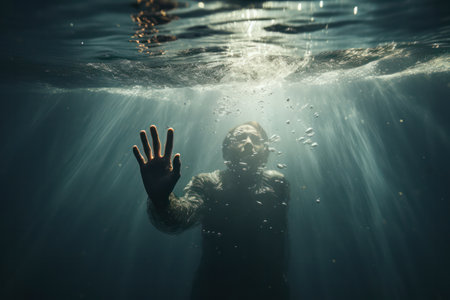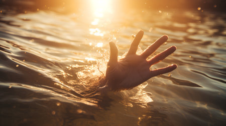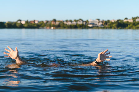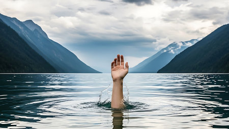Man drowning in a lake, raising hands in a desperate plea for help, struggling against the water's grip