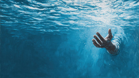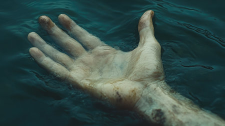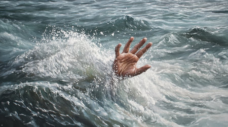 A hand emerges from turbulent ocean waves, symbolizing desperation and the struggle for survival. The powerful imagery evokes deep emotions and urgency.