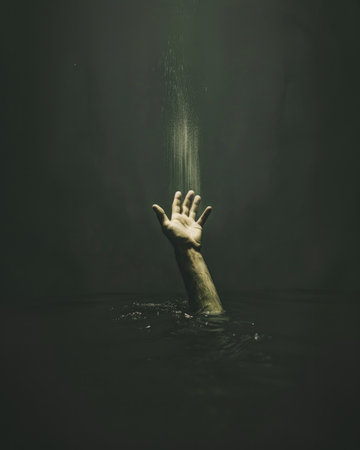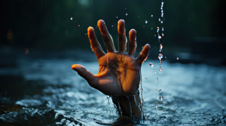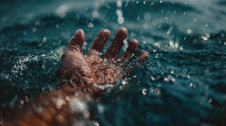 Hand of a man struggling in a river, desperately raising up for help while the overwhelming forces of water and despair