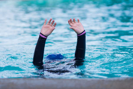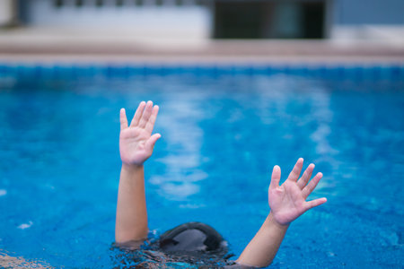 Man drowning in out door swimming pool while swimming alone, show two hands and asking for help