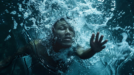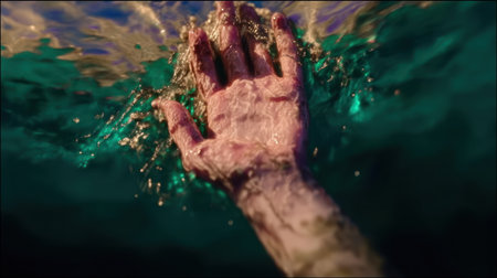 A heart-wrenching scene unfolds as a distressed male figure drowns in the sea, his scream for help echoing the concept of tragedy in a chilling visual portrayal.
