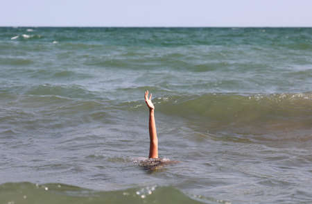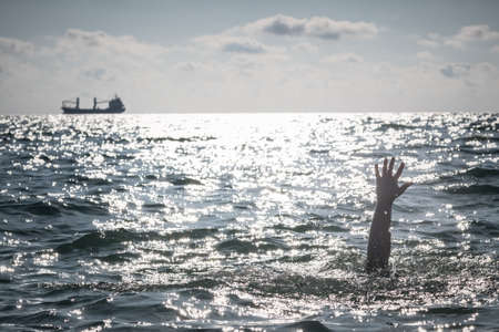 Drowning man in sea asking for help with raised his arms. Safety concept.